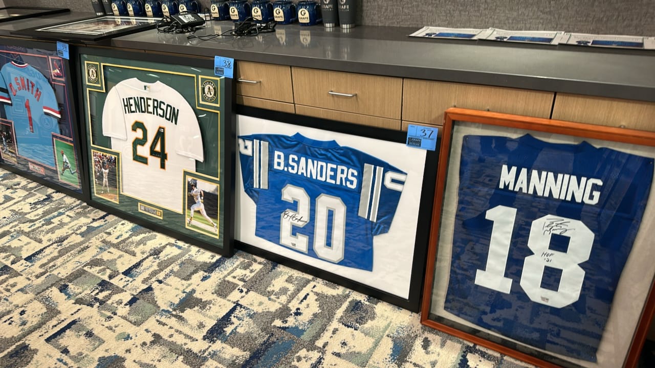 Some of the helmets and jerseys sold at the sport memorabilia auctions.