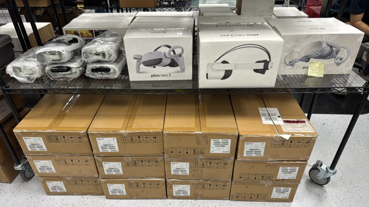 The extensive inventory included high-fidelity Varjo and HTC Vive XR Elite headsets, large quantities of new Pico 4 and Neo 3 Pro enterprise VR headsets, rare Teslasuit haptic suits, full-body motion simulators, and specialized accessories. The auction also featured Apple Mac computers, laptops, and tablets supporting the operation.