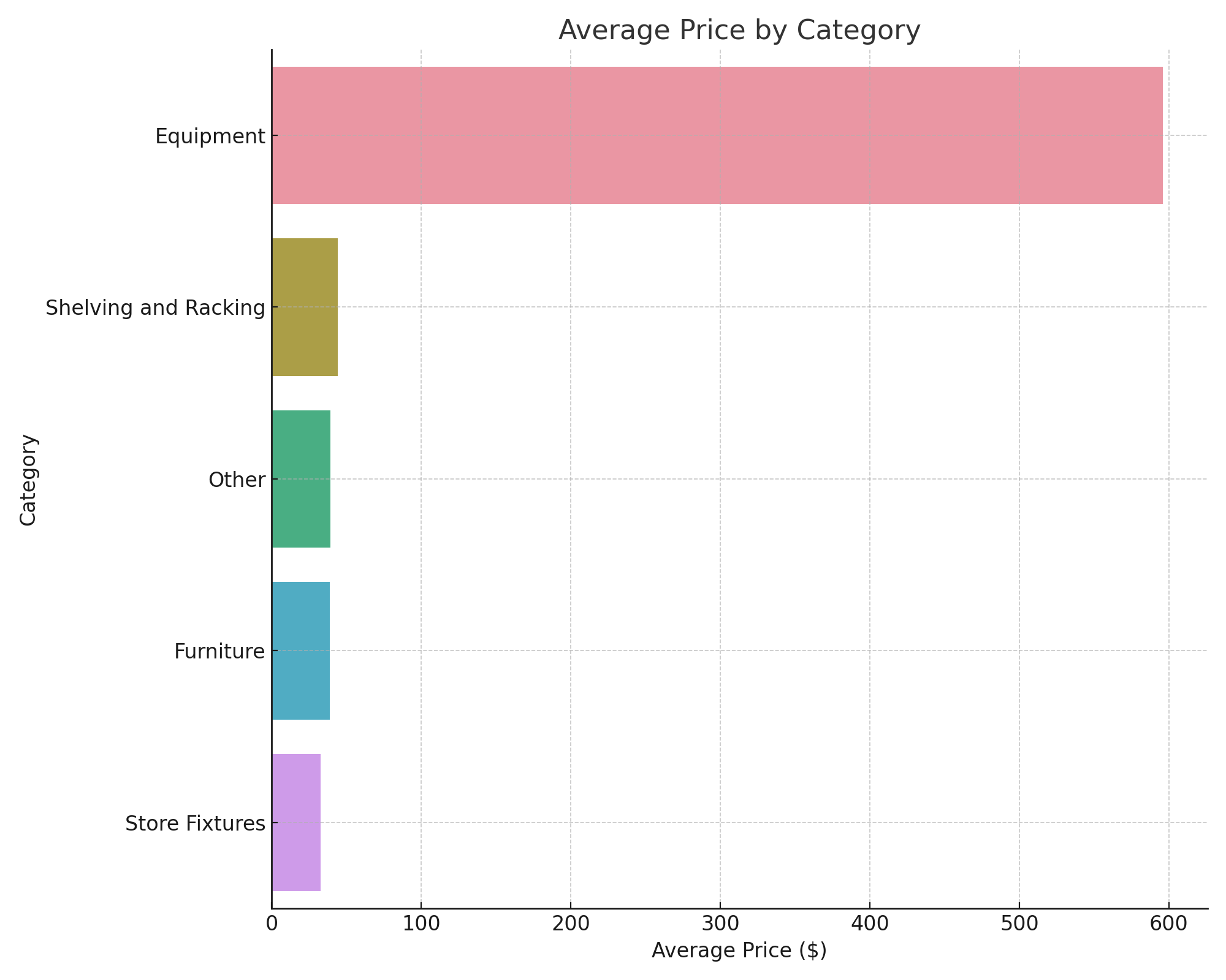 This chart displays the average price for each general category identified from the retail assets in the Staples auctions. It provides a high-level view of the price ranges associated with the different types of items listed above. As shown above, items in the 'equipment' category sold for higher prices than the other categories. That is due to the cardboard baler selling price, which is highlighted in the next graph.